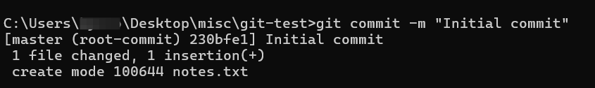 This shows a successful initial commit. Git records the commit with a unique hash and summarizes the change — in this case, one file notes.txt was added.